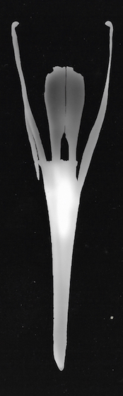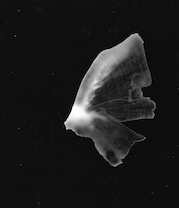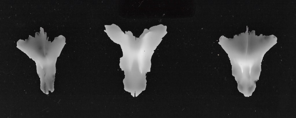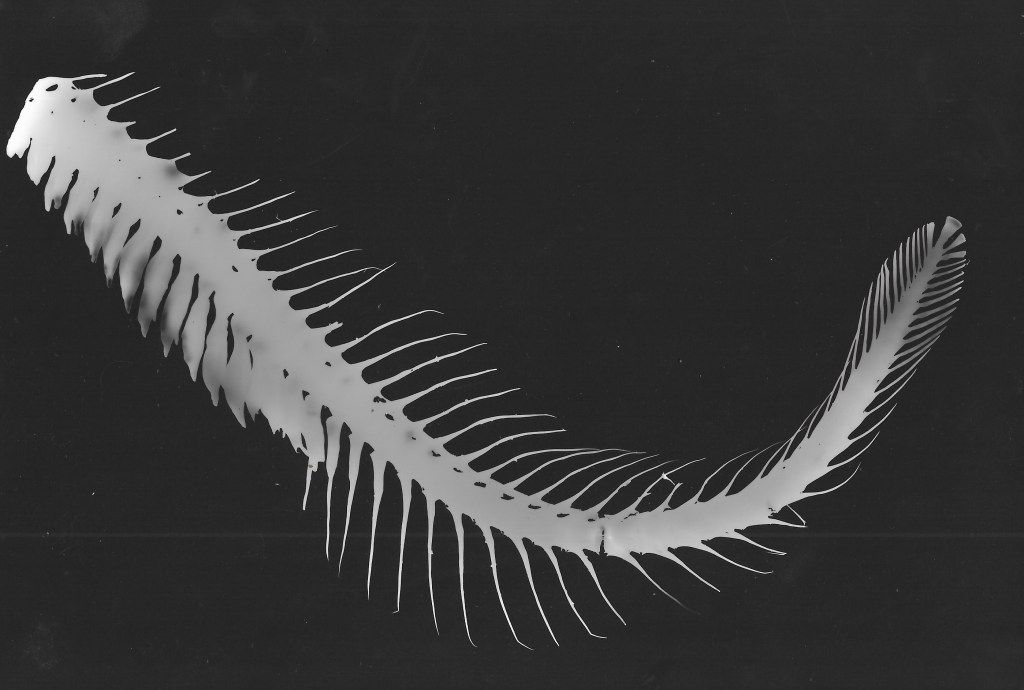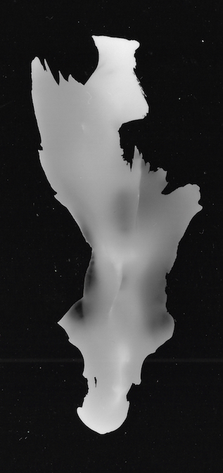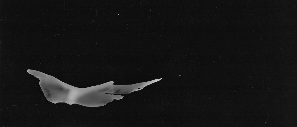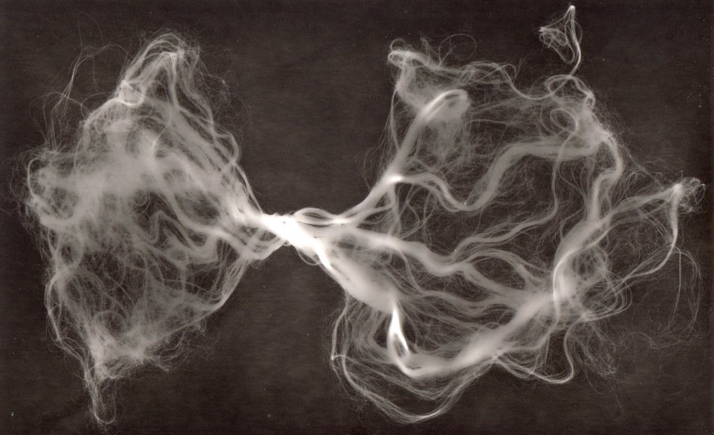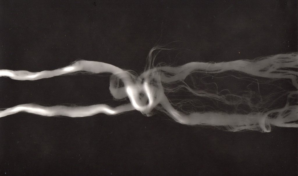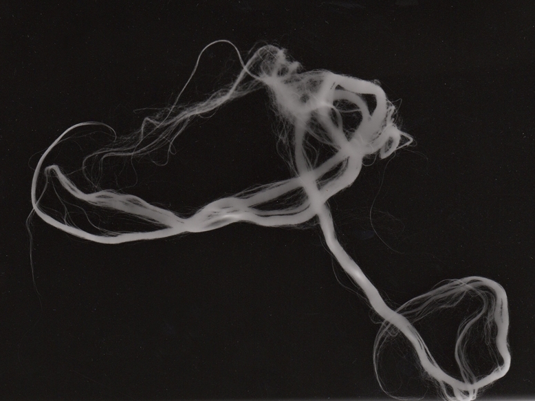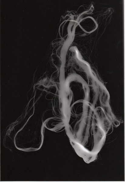 These photograms are made from silk fibres and bone fragments that are laid directly on to photographic paper and exposed to light. The image describes the transparency of the silk and bone and the light in the pictures shows that which resisted the light the most. This intriguing reversal suggests the connection made between spirit, light and dark. Silk is a mysterious fibre and there is something inherently secretive about bones. Photographers have grasped at dreams of rendering spirit visible. Photography plays with light and time and we can but imagine the truth of what we are seeing.