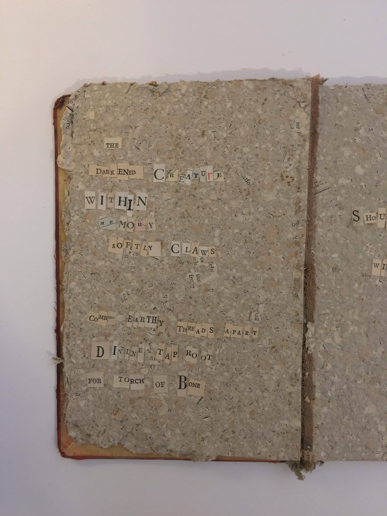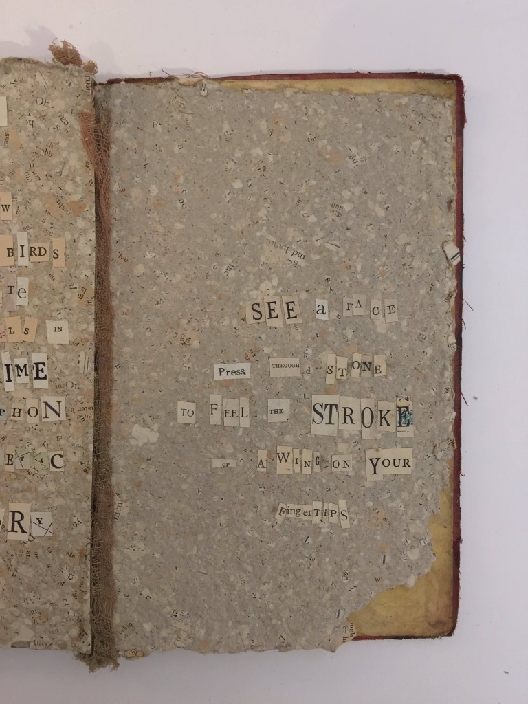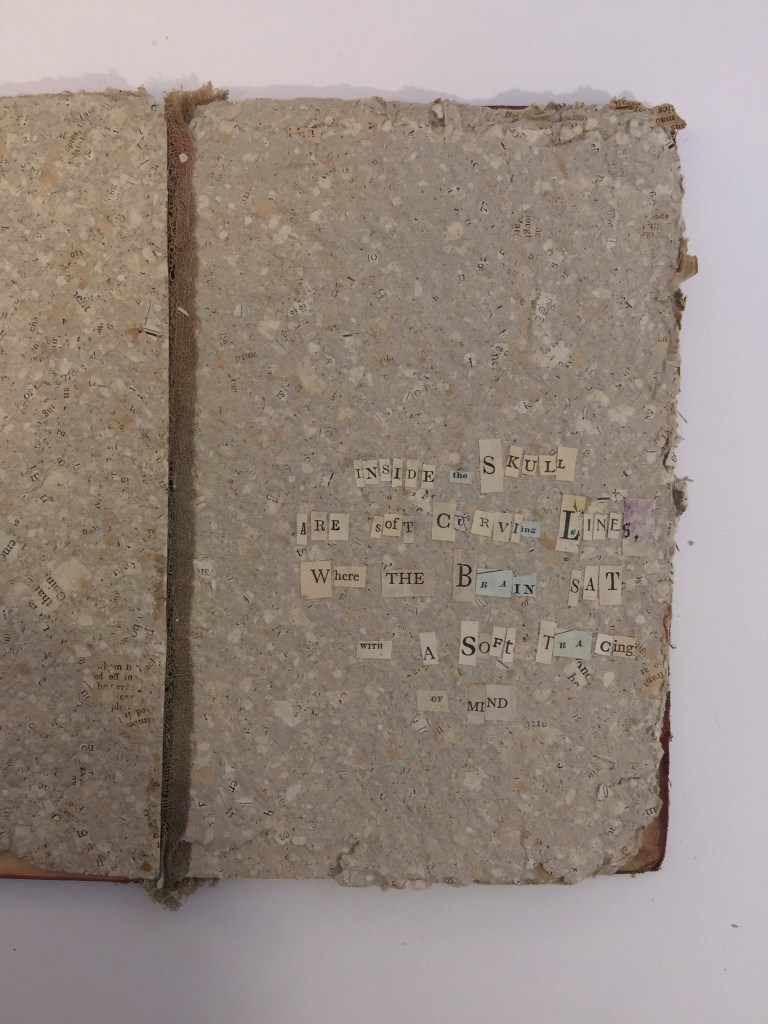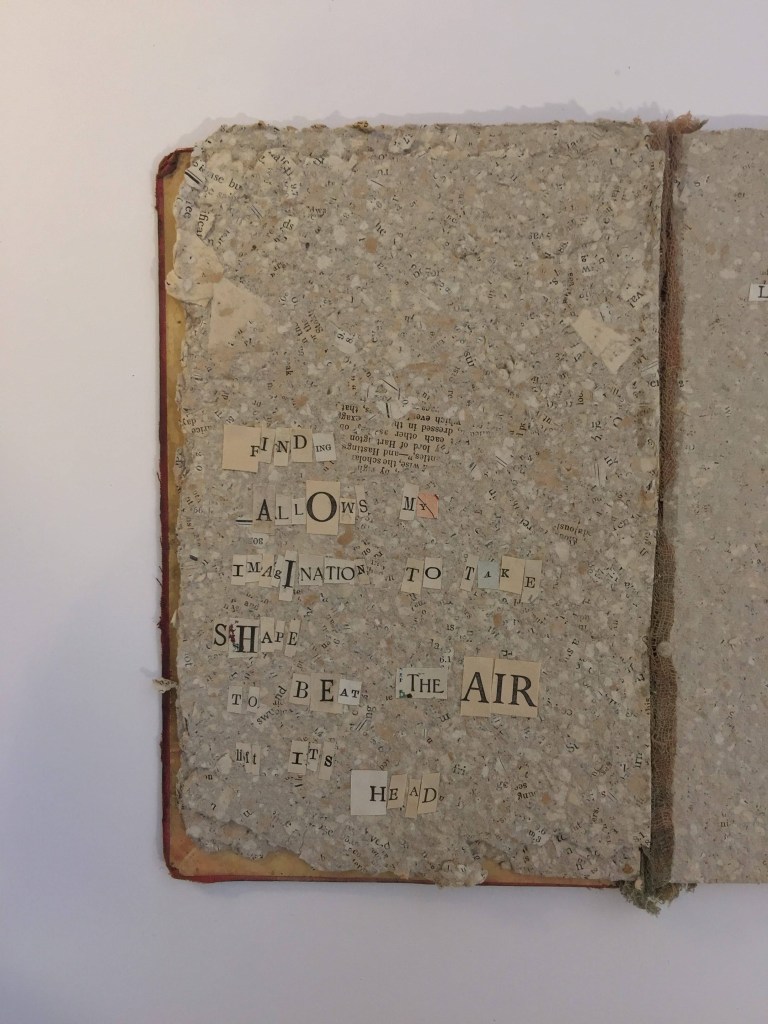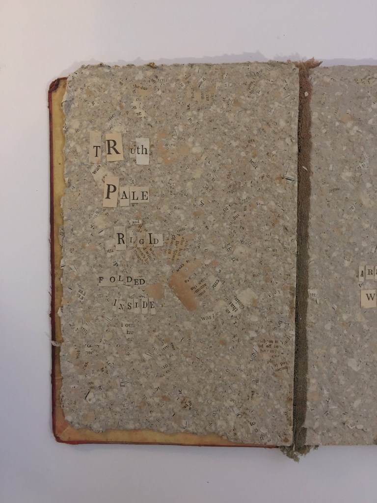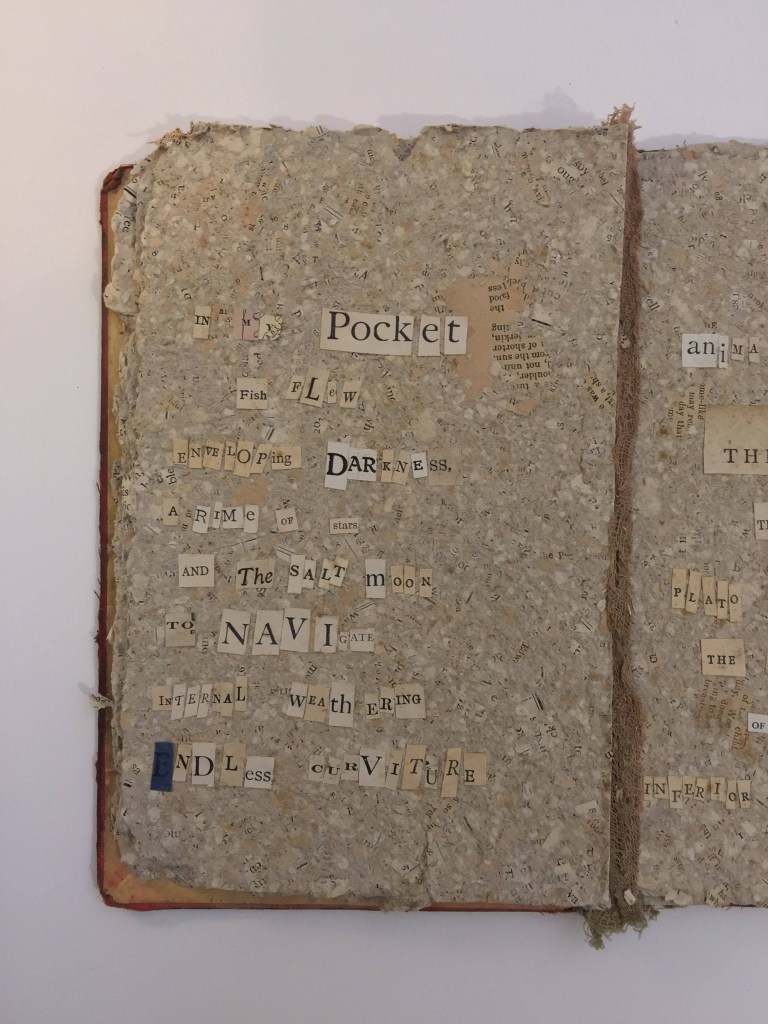 The ‘Spirit Book in Fragments’ was made from an old book of chemical spirit measures, perhaps from a brewery or apothecary. It is over a century old and when the pages were torn and pulped they released the scent of turf ash. The book had been used and annotated for decades with chemical calculations or sums. The pages were remade and combined with some water damaged old pages of text to create a new surface. Fragmented poetry, text, words and letters float like sediment, bound by my imagination.