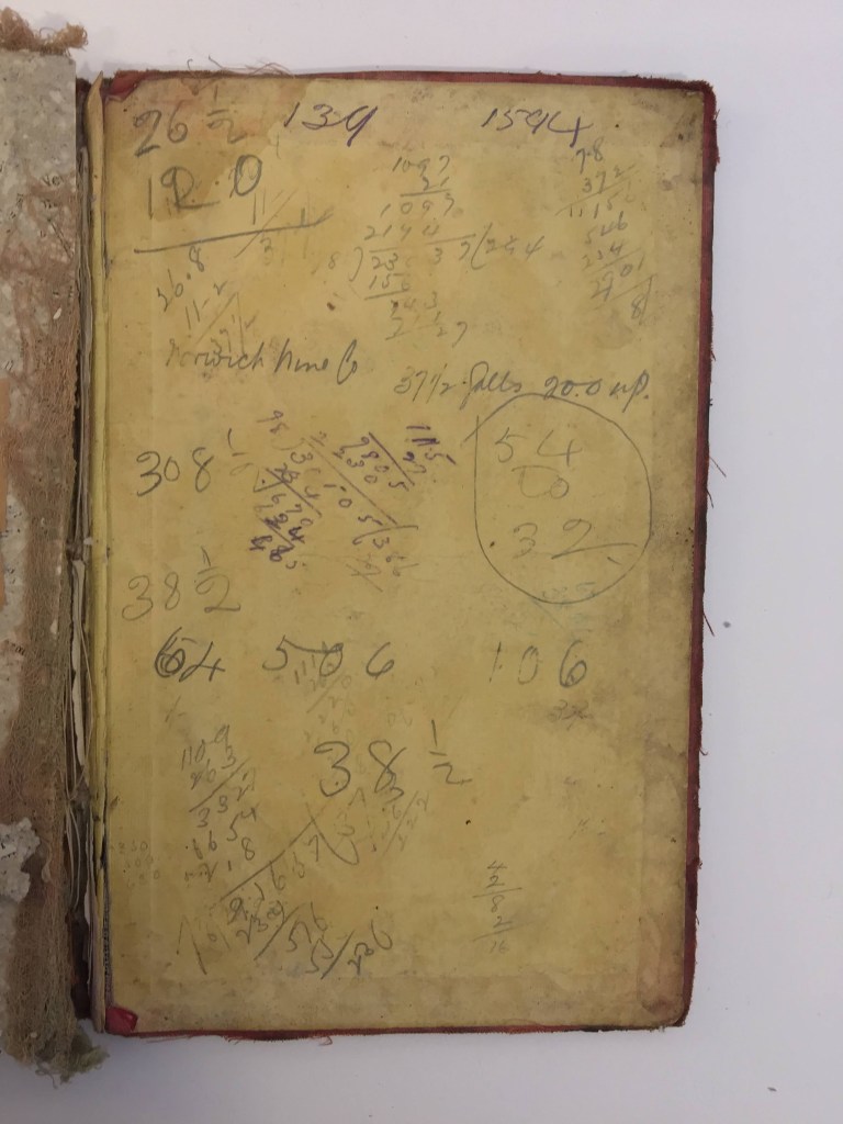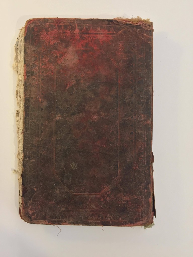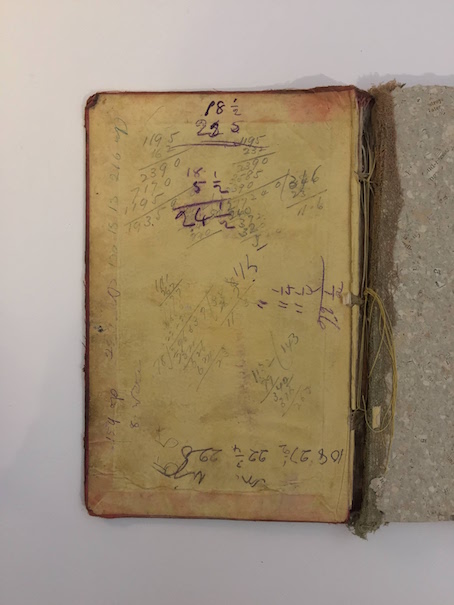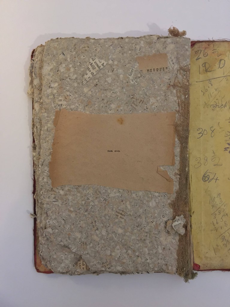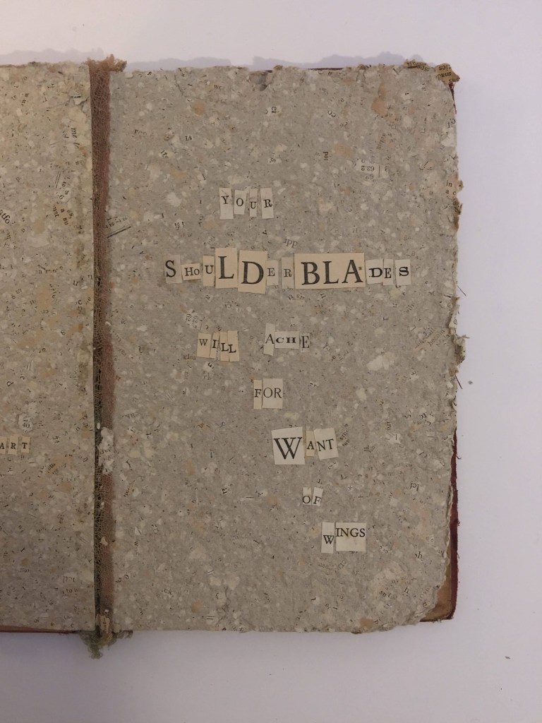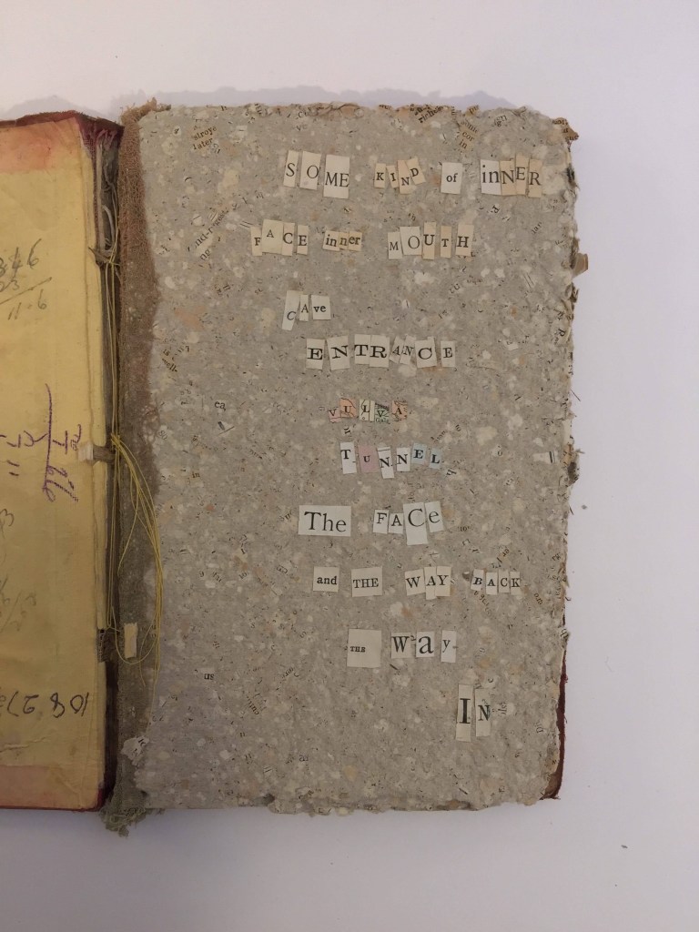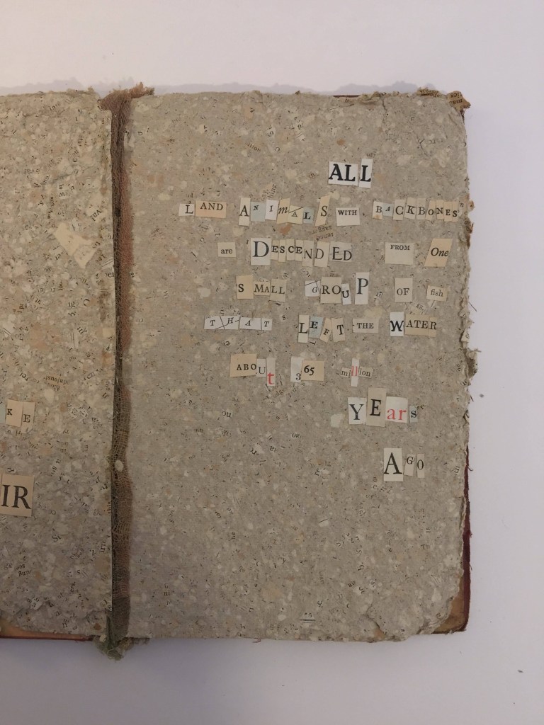The ‘Spirit Book in Fragments’ was made from an old book of chemical spirit measures, perhaps from a brewery or apothecary. It is over a century old and when the pages were torn and pulped they released the scent of turf ash. The book had been used and annotated for decades with chemical calculations or sums. The pages were remade and combined with some water damaged old pages of text to create a new surface. Fragmented poetry, text, words and letters float like sediment, bound by my imagination.